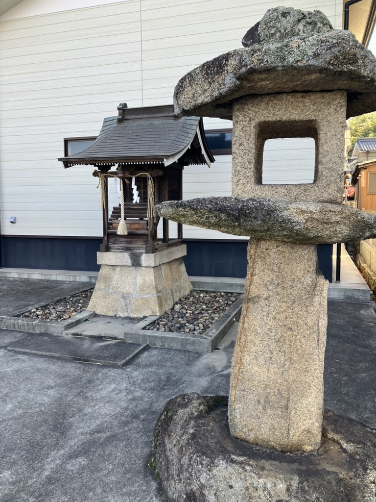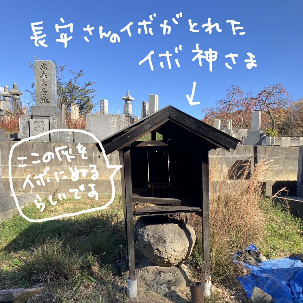 いぼ神様は、その先にある高森家の墓地の中に祀られています。丸い御神体の石を覆うように小さな社が建てられており、中には鳥居も納められています。