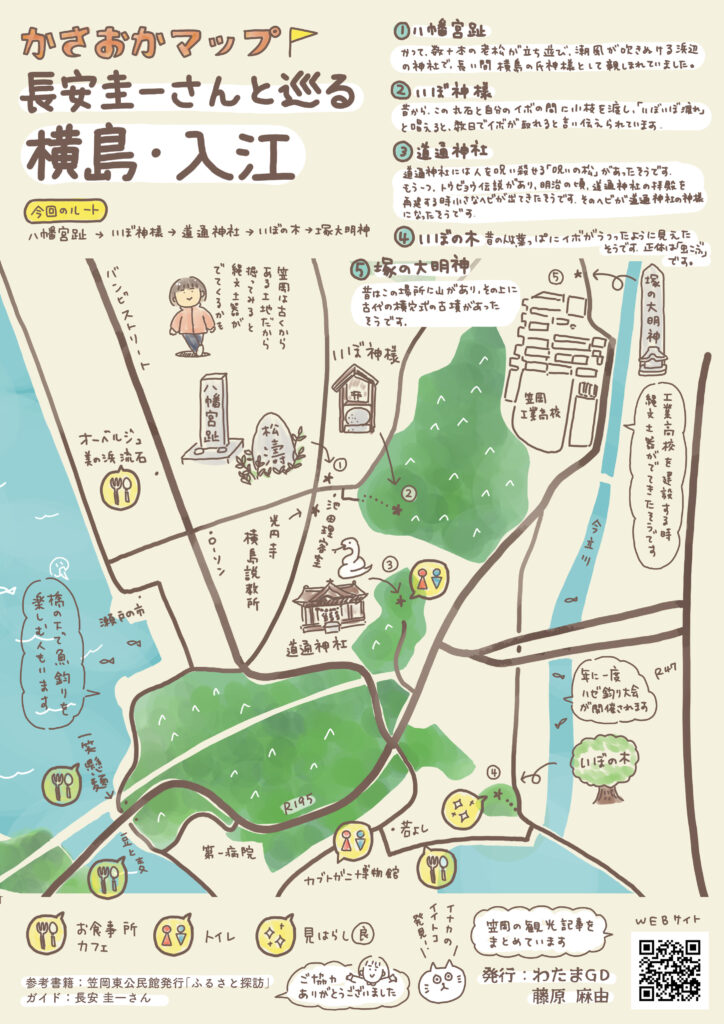 横島会館→八幡宮跡→いぼ神様→道通神社→いぼの木→工業高校裏の古墳跡