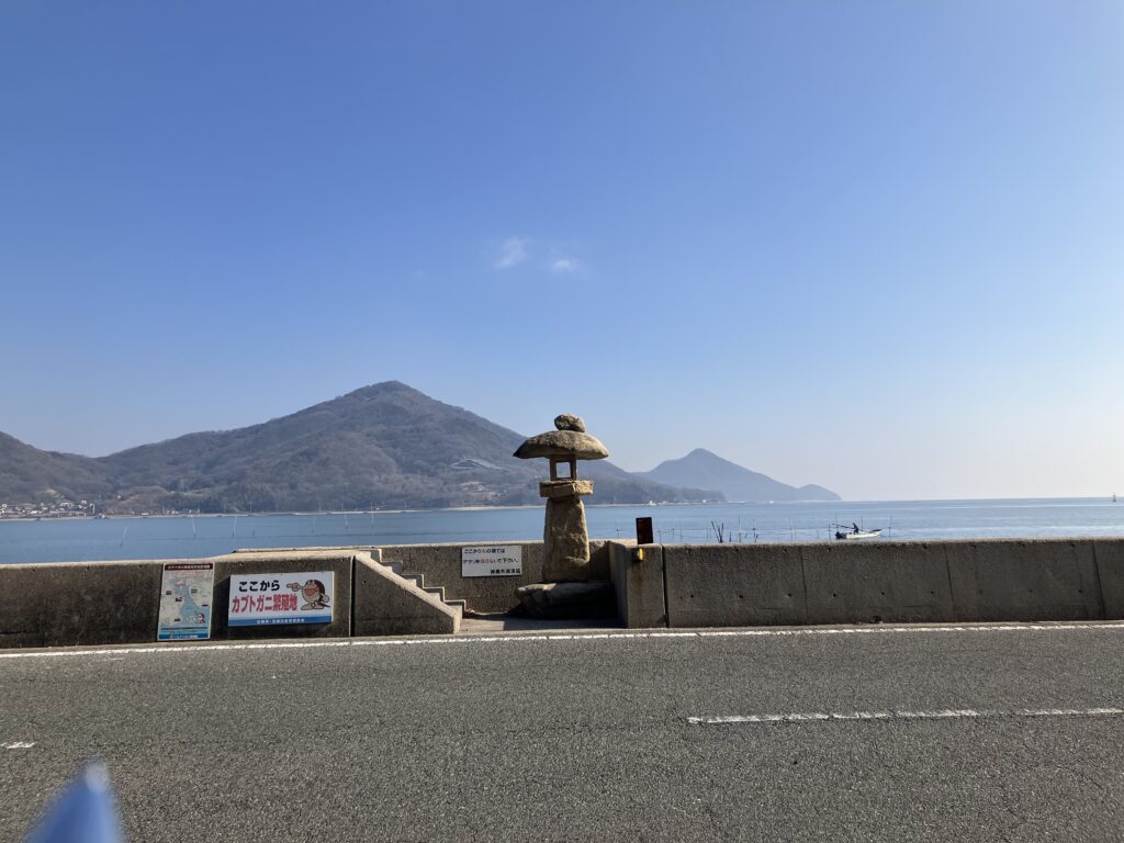 このあたりは岩盤が弱く、昔は崖がよく崩れていたそうです。道が塞がれると、人々は山を越えて笠岡へ向かったと伝えられています。今も海を望む場所に立つ常夜灯。静かな風景の中に、かつての暮らしの苦労が重なります。