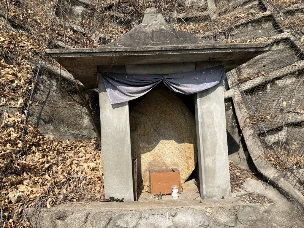 元々は磯にこの岩があったそうです。それを陸に上げたが屋根をつけていなかったため長い年月、潮風や波しぶきを受けながら、風化してしまいました。これ以上風化させないために、現在では屋根がついています。