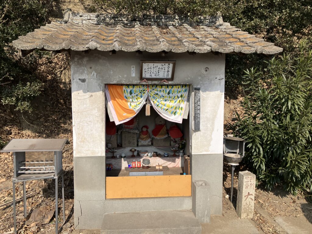 神島八十八ヶ所第21番札所・大龍寺。その奥の院には、かつて洞窟があったと伝えられています。洞窟の中には石仏のようなものが祀られていたそうですが、現在その石仏は外へ移され、洞窟自体も塞がれたといわれています。かつて人が住み着いたこともあり、安全のために閉じられたと伝えられています。。