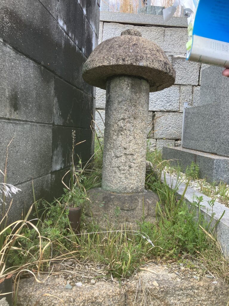 日光寺裏の墓地に、変わった形をした石塔があります。花崗岩製で、円柱形の塔身と丸い形の笠を持っています。特異な形式の墓石で、墓制史上非常に珍しいものといわれています。