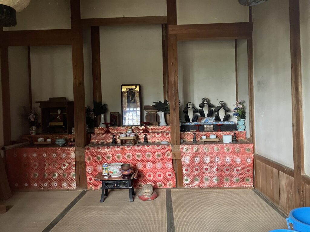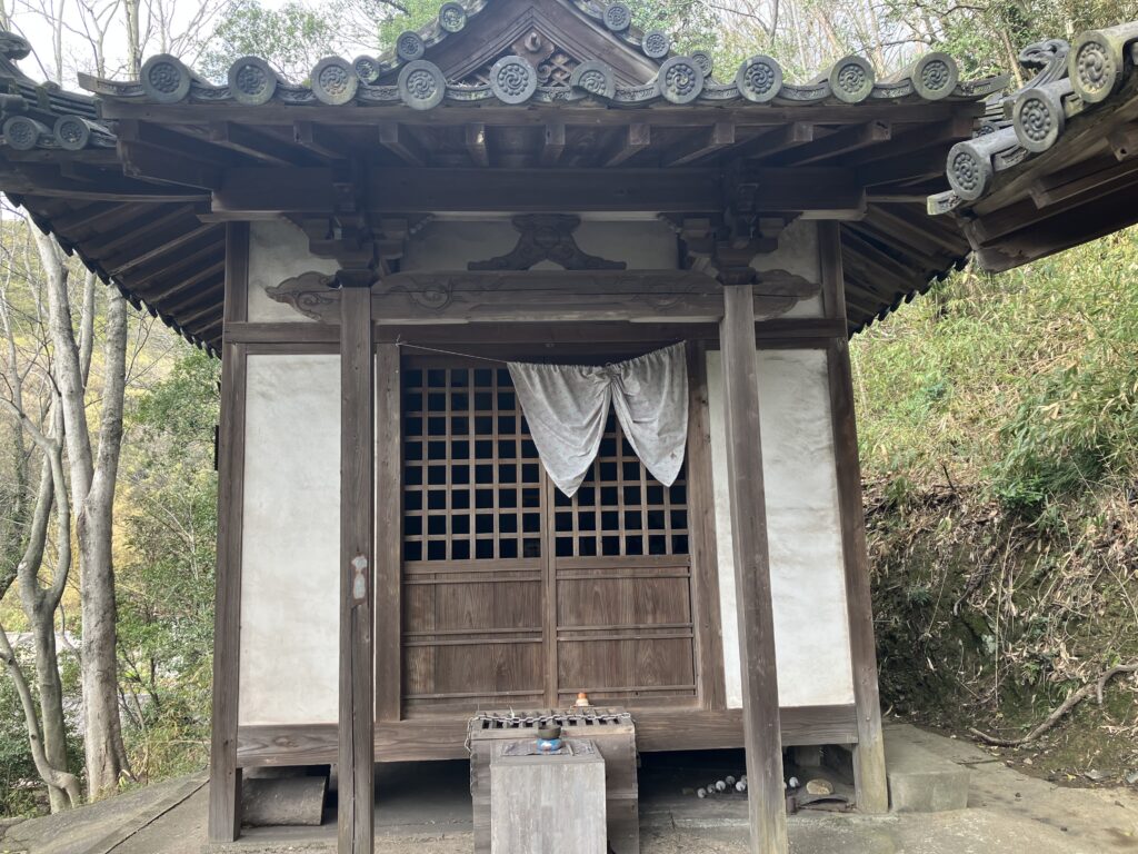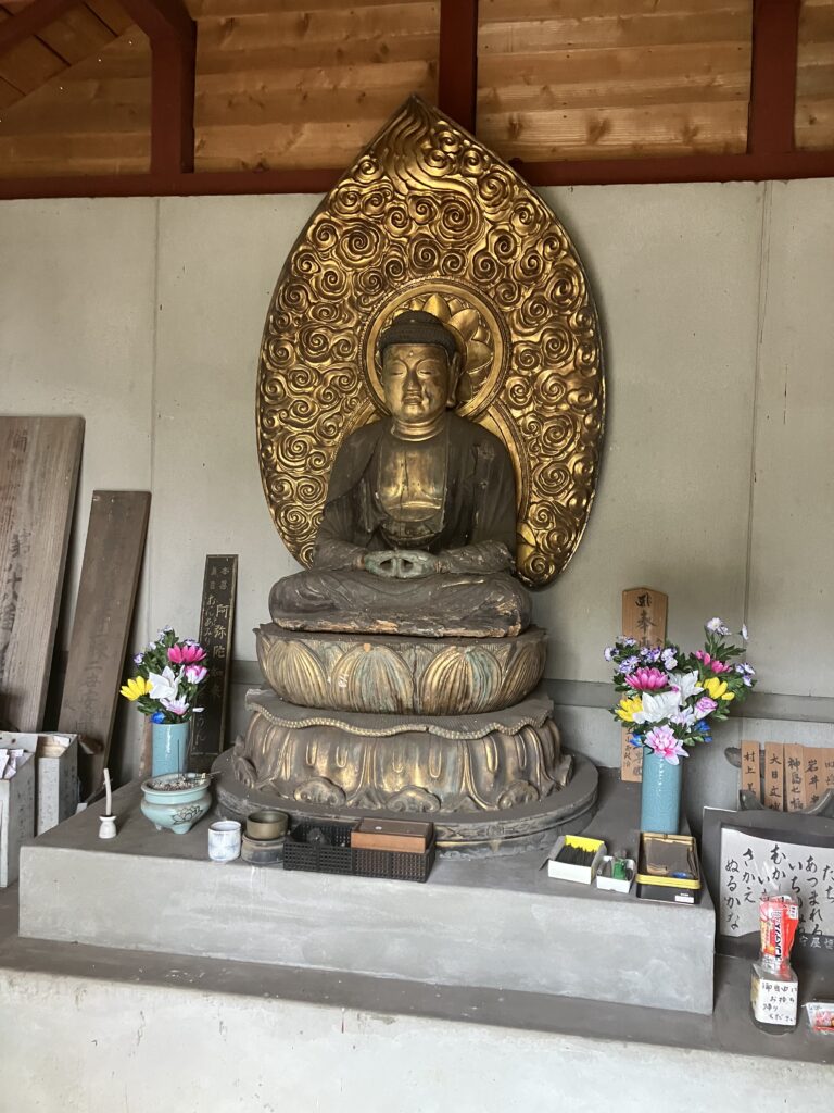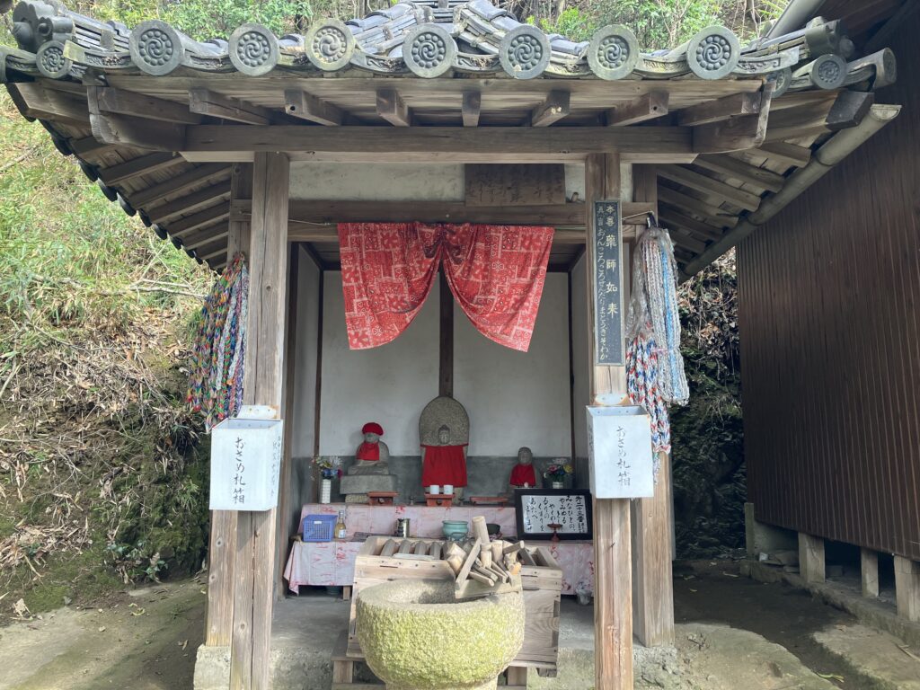 ご本尊は薬師如来です。堂舎の前に石臼と小槌が置かれています。この小槌で石臼を撫でて、その小槌で自分の体の悪い部分をさすると、よくなると言われています。