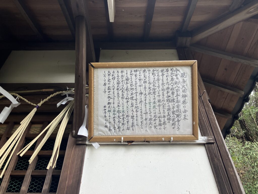 御祭神は神日本磐余彦命(かみやまといわれひこのみこと(神武天皇))と興世姫命(おきよひめのみこと(神武天皇の妻))。創建は奈良時代(726)と伝えられ、室町時代(1547)に本殿の御造営が行われたことが棟札によって知られています。